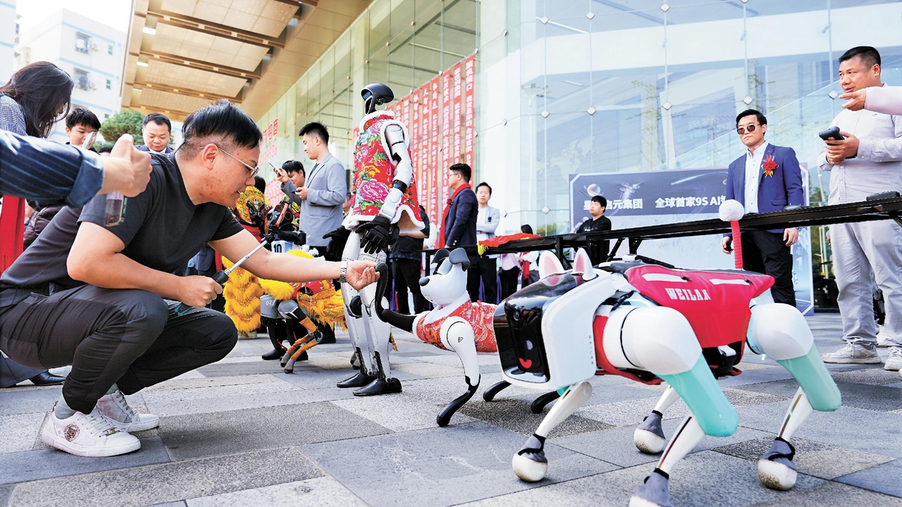 Visitors interact with robotic dogs during the opening of the 9S AI Intelligence Center in Longhua District.