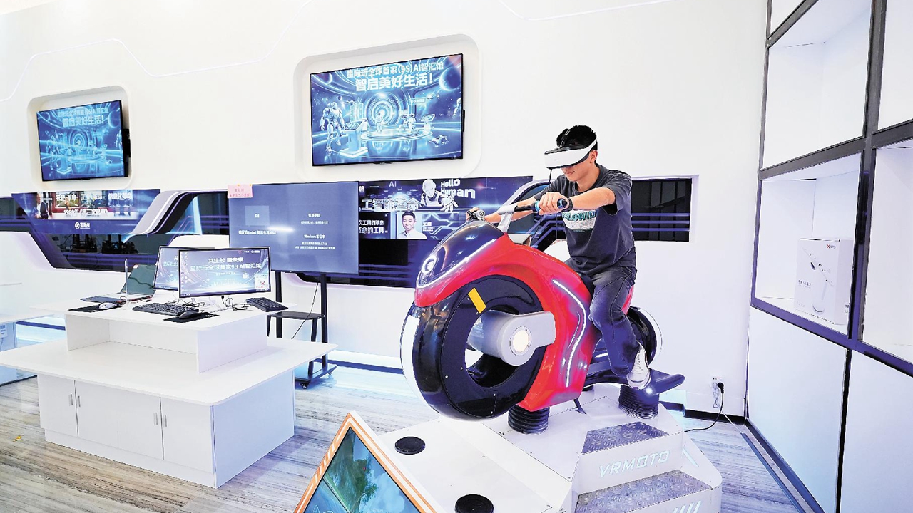 A visitor tries a VR-powered motorcycle simulator at the 9S AI Intelligence Center in Shenzhen.