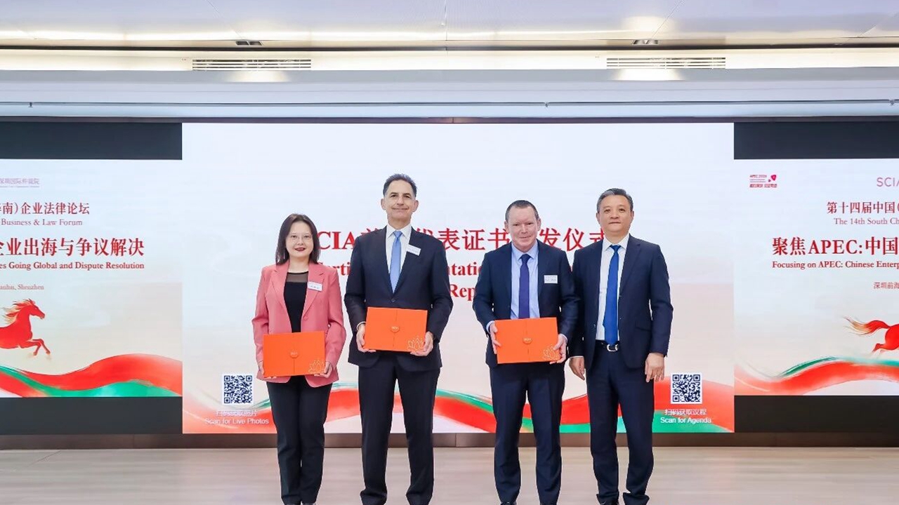 Arbitrators receive certificates as newly appointed Shenzhen Court of International Arbitration (SCIA) chief representatives during the event.