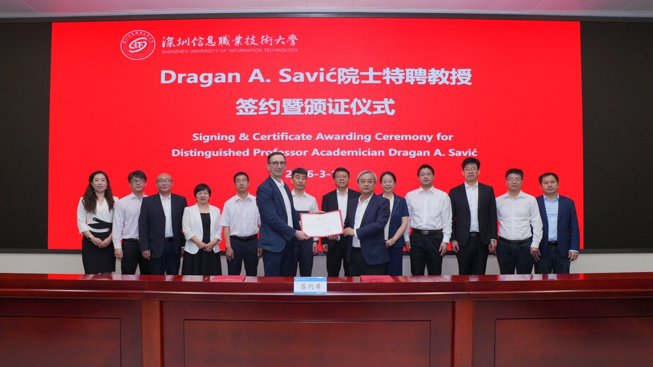 Shenzhen University of Information Technology (SUIT) has officially appointed Dragan A. Savić, a Fellow of the Royal Academy of Engineering and a Member of the European Academy of Sciences, as a Distinguished Professor and the appointment was finalized during a signing and certificate presentation ceremony held at the university March 19.