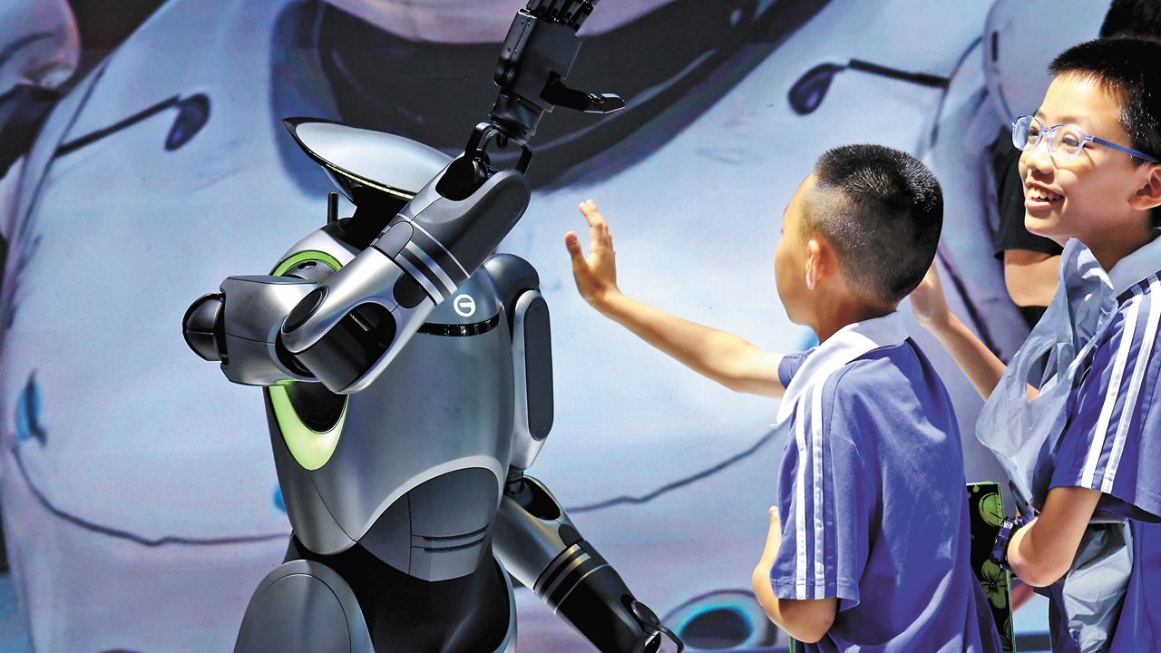 Children interact with a humanoid robot at the 21st China (Shenzhen) International Cultural Industries Fair on May 23, 2025.