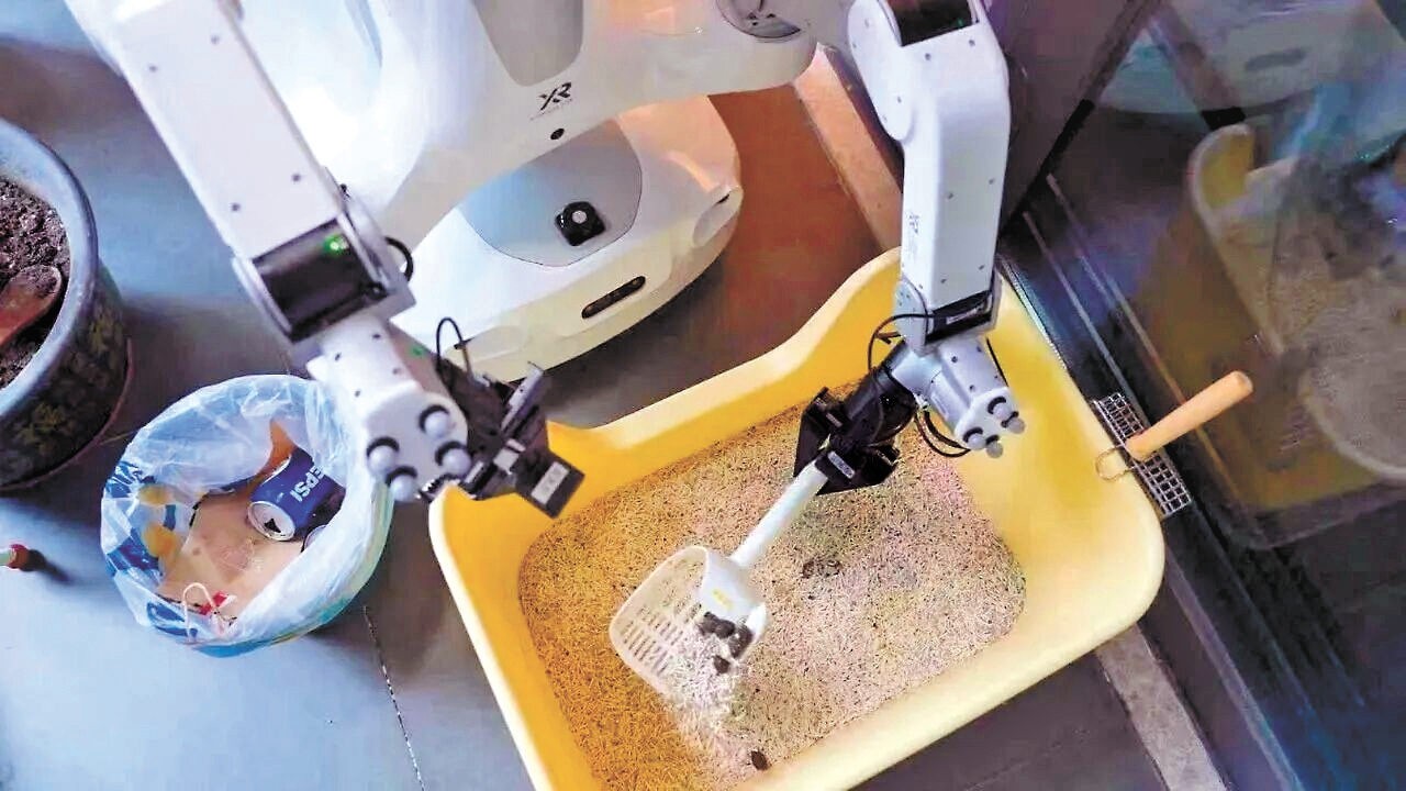China’s first home cleaning robot cleans a pet litter box at a home in Shenzhen. File photo