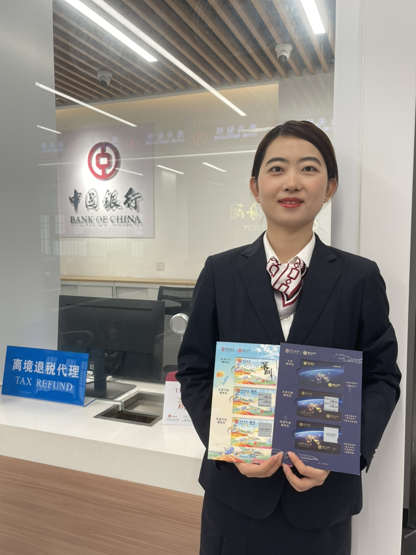 A Bank of China staff member displays tax refund materials at a service counter in Shenzhen on Monday. Photos from Dute
