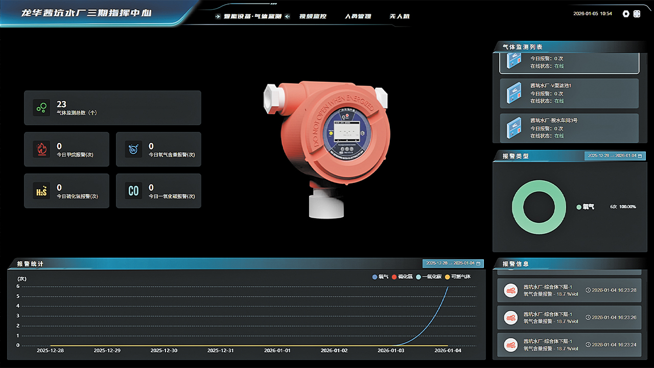 A real-time dashboard of the smart management system at Phase III of Xikeng Water Plant in Longhua District, displaying gas monitoring, equipment status and safety alerts.