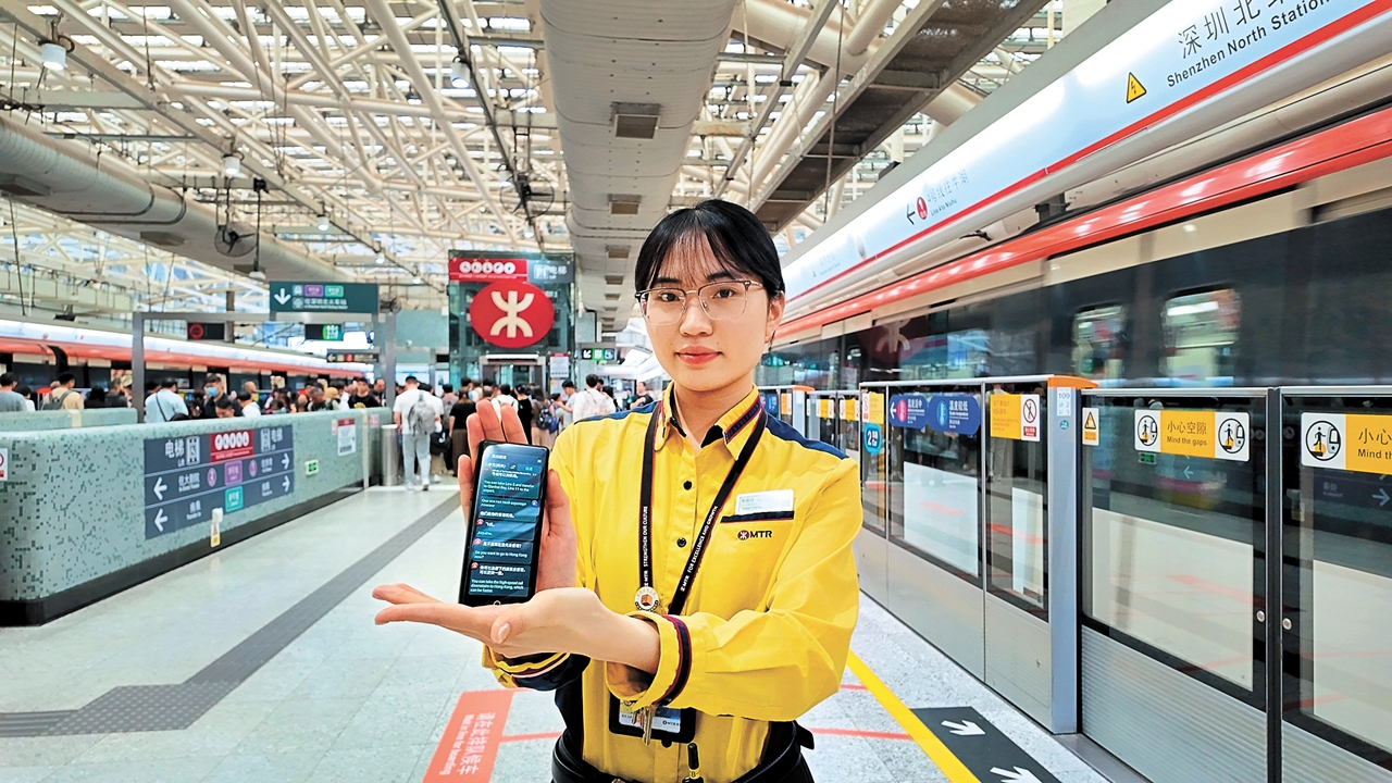 A Shenzhen Metro staffer demonstrates a smart multilingual translator.