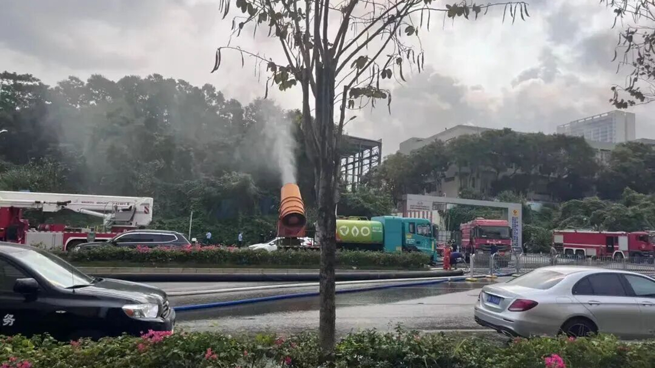 Fire engines and emergency crews continue dousing a facility at BYD’s Pingshan plant in Shenzhen this morning.