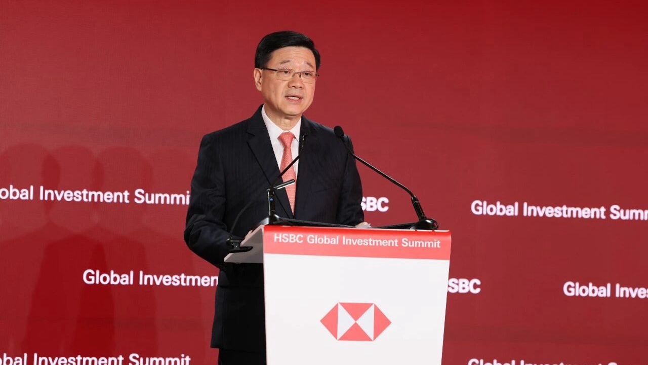 Hong Kong Chief Executive John Lee gives a speech at HSBC’s third Global Investment Summit on April 14. CNS
