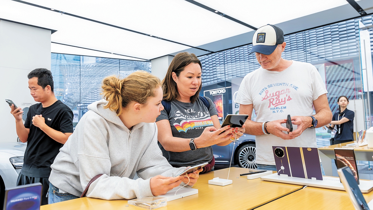 Visitors try on the Pura X Max, a new foldable screen phone by Huawei, at a store in One Avenue, Futian District. Lai Li